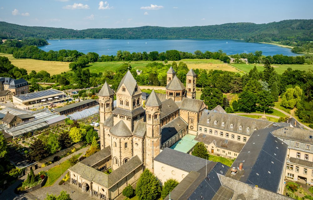Glitzernd liegt der Laacher See inmitten der idyllischen Eifellandschaft …